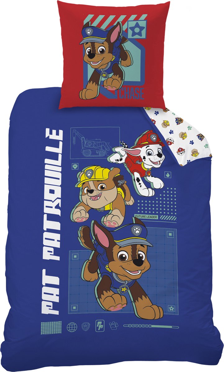 Paw Patrol Dekbedovertrek, Patou. Stoer dekbedovertrek van Paw Patrol. Met helden als Chase, Rubble en Marshall ben jij verzekerd van een goede nachtrust! Deze heldenpups zijn niet bang voor een uitdaging. De set heeft een tweezijdige bedrukking wat leuke opties geeft bij het opmaken van het bed. Gemaakt van heerlijk zacht katoen! Een leuke aanwinst voor elke stoere slaapkamer een een leuk cadeau idee voor elke fan van Paw Patrol.