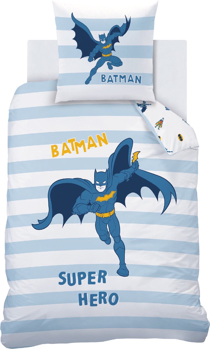 Batman Dekbedovertrek, Super Hero. Mooi, gestreept dekbedovertrek van de superheld Batman. Gemaakt van heerlijk zacht katoen. Deze fijne set heeft een geweldige print van Batman in actie. Draai je de set om, dan zie je een dessin van Batman, Robin en Batman logootjes. Een geweldige blikvanger en leuk om eens af te wisselen met het opmaken van het bed. Ben je een echte superhelden fan? Dan mag deze set niet in je collectie ontbreken! Ook leuk om cadeau te geven voor een verjaardag of de feestdagen.