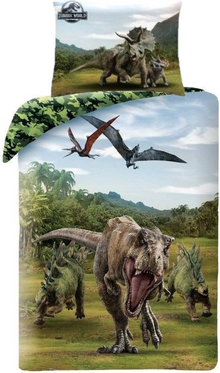 Jurassic World Dekbedovertrek, Camo. Gaaf eenpersoons katoenen dekbedovertrek met extra groot kussensloop van Jurassic World. Op het dekbedovertrek zie je allerlei verschillende dinosaurussen, een T-Rex, Triceratops en nog veel meer! Op de achterkant zie je een camouflage patroon. Leuk voor elke liefhebber van dinosaurussen of Jurassic World!