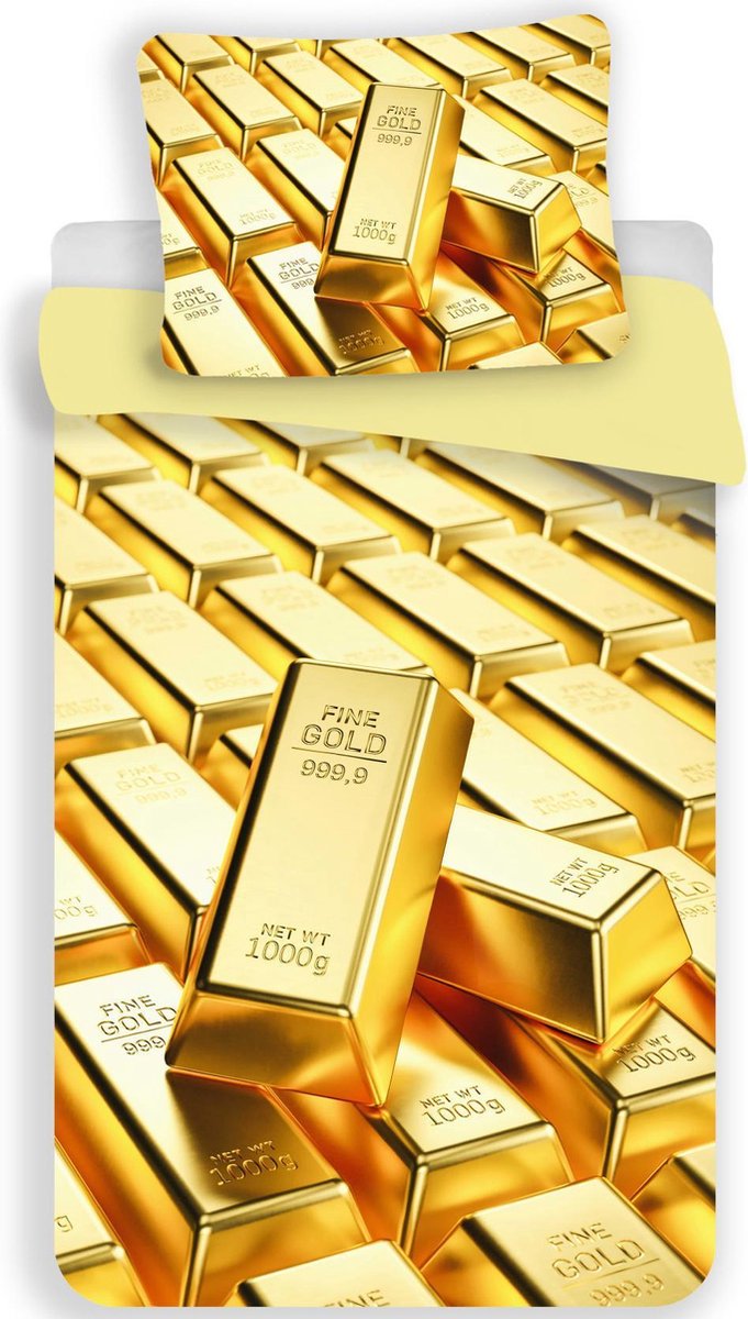 Goud dekbedovertrek, Gold Bars. Fantastisch eenpersoons polyester dekbedovertrek van een stapel goudstaven. Dit mooie dekbedovertrek past perfect in de slaapkamer van elke liefhebber van dit kostbare en imponerend edelmetaal. Een echte aanwinst én blikvanger voor de fans die van *bling* houden. Wie maak jij blij met dit cadeau? Kenmerken Formaat 140 x 200 cm Kussensloop 70 x 90 cm Extra groot! Materiaal 100% Polyester Wasbaar... lees meer over dit product