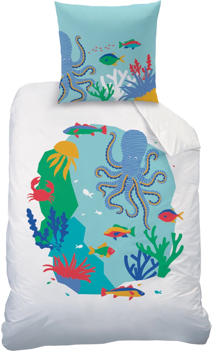 Matt & Rose dekbedovertrek, Oceaan. Op dit prachtige dekbedovertrek van hoge kwaliteit zie je een prachtig design van een onderwaterwereld. De octopus heeft het naar zijn zin tussen al het koraal. De vissen en de prachtige kleuren maken dit dekbedovertrek tot een fantastisch product. Ook leuk om cadeau te doen.