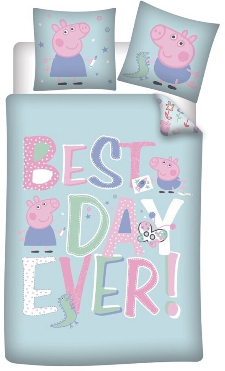 Peppa Pig Dekbedovertrek Best day Ever 140 x 200 cm - Polyester Peppa Pig dekbedovertrek, Unicorn. Leuk kleurrijk polyester eenpersoons dekbedovertrek van Peppa Pig op een heel mooie eenhoorn. Met haar eenhoorn voelt Peppa zich helemaal in de wolken. Op de achterkant staat een druk van Peppa, eenhoorns en wolkjes op een witte achtegrrond. Wij raden aan om het overtrek binnenstebuiten te wassen om de duur van het dekbed te verl... lees meer over dit product