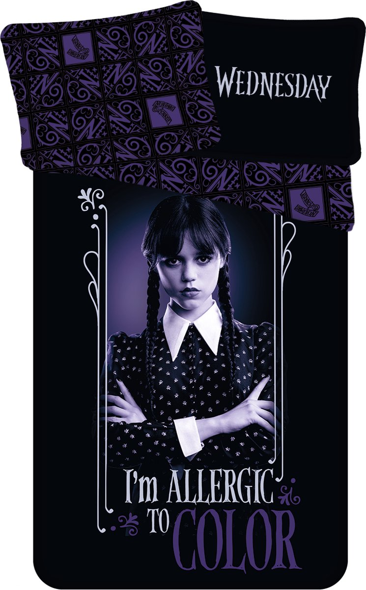 Wednesday Dekbedovertrek, Allergic to Color. Heb jij ook zo genoten van de Netflix serie Wednesday met in de hoofdrol Jenna Ortega? Dan zal je dit katoenen dekbedovertrek vast en zeker gaan waarderen! Met een stoere afbeelding van Wednesday Addams op dit overtrek, heb jij een echte blikvanger te pakken! De overtrek en (extra grote) kussensloop zijn dubbelzijdig bedrukt, wat leuke opties geeft bij het opmaken van het bed. Ook leuk om cadeau te geven aan een echte fan van het oculte en de Addams Family!