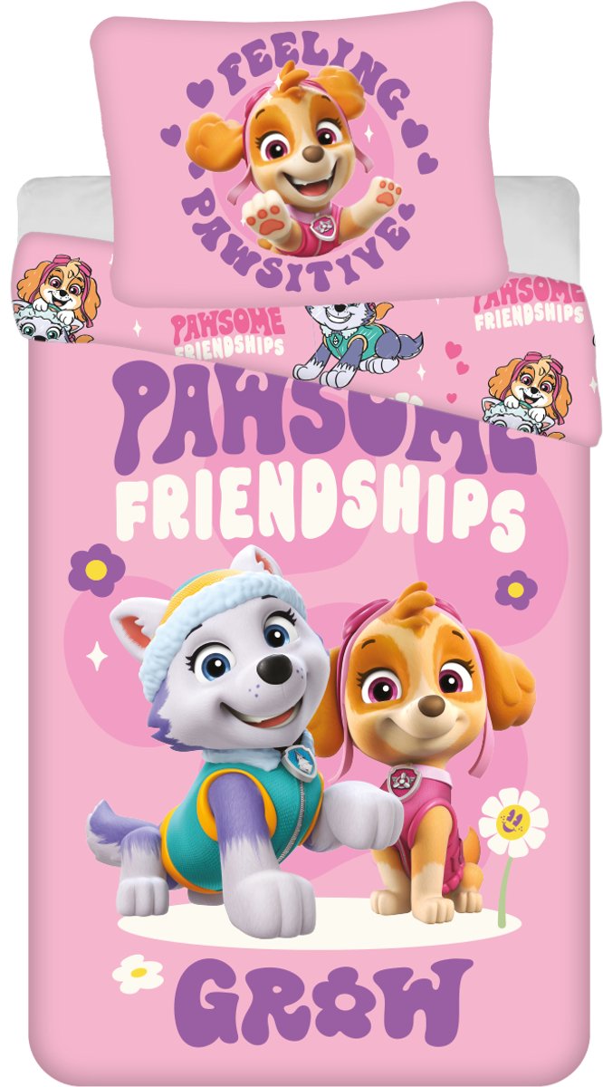 PAW Patrol Dekbedovertrek, Pawsome Friendship. Leuk, roze dekbedovertrek gemaakt van polyester van de bff's Everest en Skye! Ben jij ook zo'n fan van deze geweldige pups uit de Paw Patrol serie? Dan is dit dekbed een aanwinst voor jouw slaapkamer! Voorzien van een leuke tweezijdige print, waardoor er gevarieerd kan worden met het opmaken van het bed. De extra grote kussensloop maakt de set helemaal af! Een leuk cadeau idee voo... lees meer over dit product