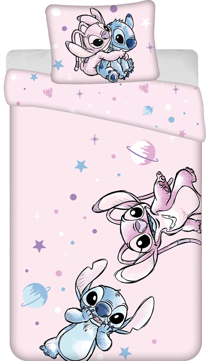 Slapen tussen de sterren? Dit vrolijke Disney's Lilo & Stitch dekbedovertrek brengt je slaapkamer naar een andere dimensie! Op de roze voorzijde zweven Angel en Stitch samen door de ruimte, omringd door kleurrijke sterren en planeten, klaar voor een intergalactisch droomavontuur. De achterzijde heeft een afwijkend design, waardoor er afgewisseld kan worden met het opmaken van het bed. De set is gemaakt van 100% katoen, heerlij... lees meer over dit product
