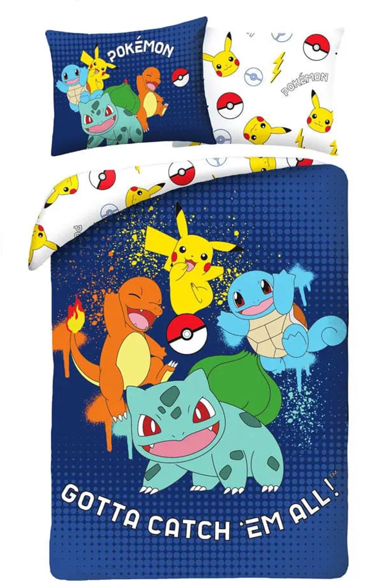Pokémon Gotta Catch Em All Dekbedovertrek 140 x 200 cm (70 x 90 cm). Zij hebben wel een dagje rust verdiend! Dit gave katoenen dekbedovertrek van een paar van de bekendste Pokémon karakters erop, is een echte musthave voor de die-hard Pokémon fan. Hiermee haal je een echte blikvanger in huis. Mede door het extra grote kussensloop en de tweezijdige bedrukking van het overtrek. Leuk om eens af te wisselen met het opmaken van het bed. Kortom; een leuk item om cadeau te doen óf te krijgen!
