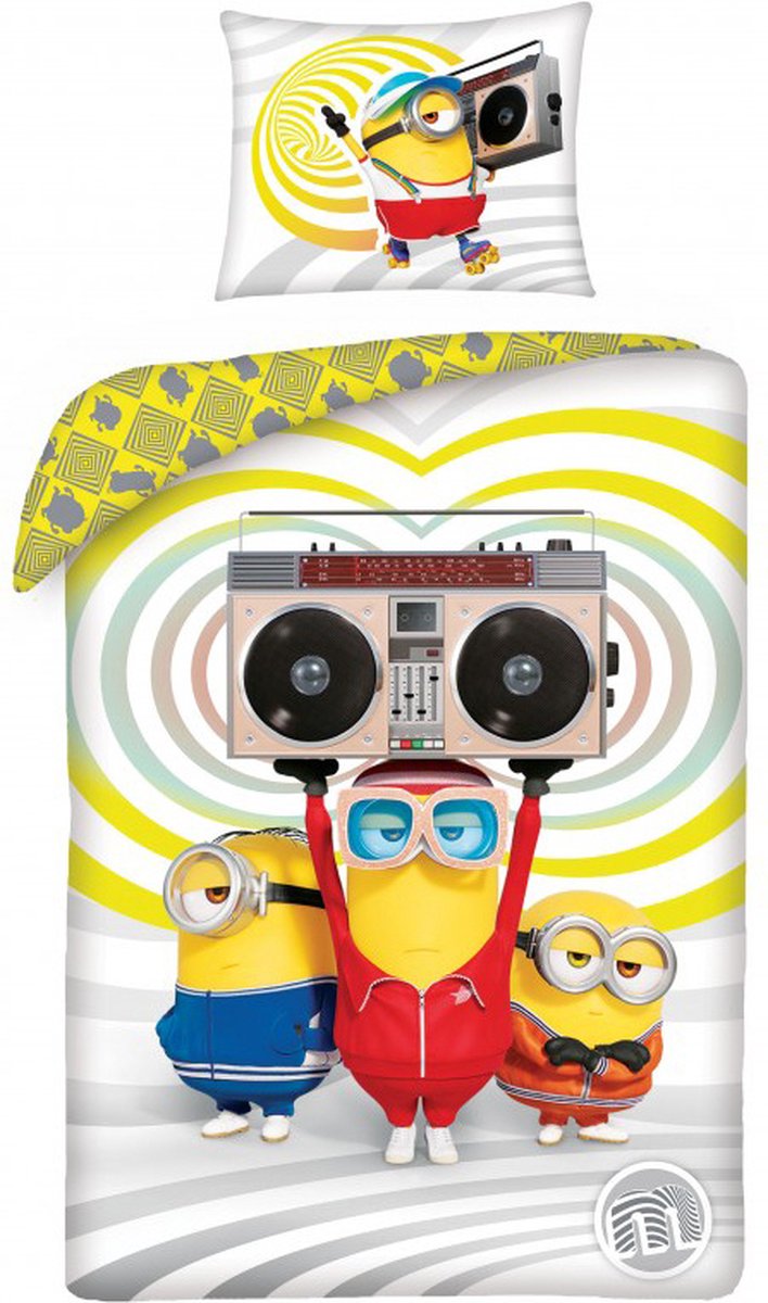 Minions Dekbedovertrek, Boogie. Ready to boogie? Deze Minions staan klaar met hun ghettoblaster om hun gekste dans-moves te laten zien. Doe jij met ze mee? Kevin, Bob en Stuart zijn maar een paar van de gekke Minions uit de Verschrikkelijke Ikke films. Ben jij ook zo'n fan van deze wezentjes en de Minions-films? Dan mag dit katoenen dekbedovertrek niet ontbreken in je collectie! De overtrek is dubbelzijdig bedrukt en de kussensloop is extra groot. Kortom; een ware blikvanger voor je kamer én een leuk cadeau-idee voor een Minion-fan.