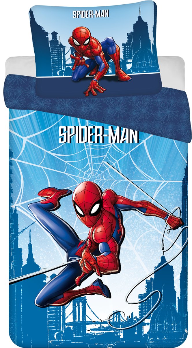 SpiderMan Dekbedovertrek, Web - Eenpersoons - 140 x 200 cm - Katoen Spider-Man Dekbedovertrek, Web. Gaaf, katoenen, dekbedovertrek van de superheld Spider-Man. Deze held slingert zich een weg door de stad, op zoek naar avontuur! Klaar voor actie! Dit stoere blauwe dekbedovertrek heeft een dubbelzijdige print, wat leuke opties geeft bij het opmaken van het bed. Een echte blikvanger voor elke stoere slaapkamer! Gemaakt van 100% ... lees meer over dit product