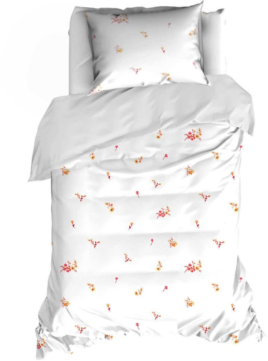 Dit dekbedovertrek omhult je met verfijnde zachtheid en een aangenaam koel comfort, ideaal voor wie houdt van een frisse, elegante slaapbeleving. De hoogwaardige afwerking en de extra wijde flessenhals instopstrook zorgen voor een perfecte pasvorm en een vlekkeloze uitstraling in elke slaapkamer. Het dekbedovertrek heeft een subtiel dessin van roze/oranje bloemen op een witte achtergrond. De achterzijde heeft een neutrale witte kleur.