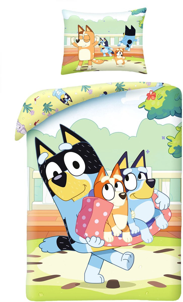Bluey Dekbedovertrek Bandit, Bluey and Bingo 140 x 200 cm - katoen Wij raden aan om het overtrek binnenstebuiten te wassen om de duur van het dekbed te verlengen. Grootte: 140 x 200 cmKussensloop: (1x) 70 x 90 cmMateriaal: katoenWasbaar op 40 gradenGeschikt voor wasdrogerWassen voor gebruik Inhoud:1 Dekbedovertrek1 Kussensloop lees meer over dit product