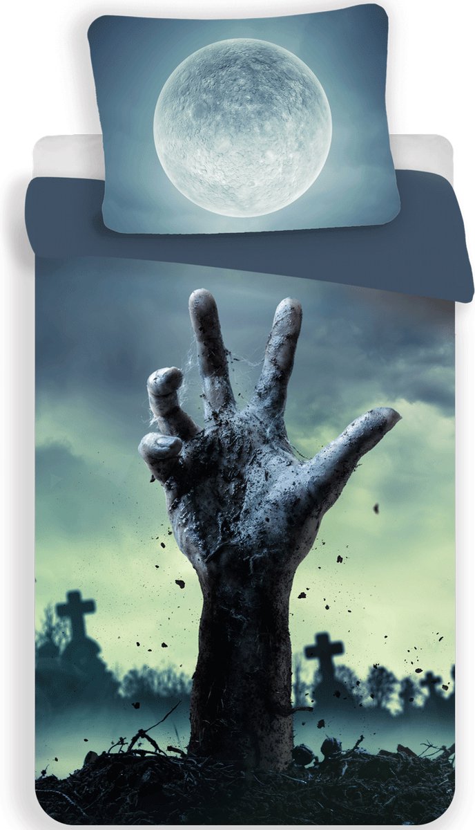 Sweet Home Dekbedovertrek, Zombie. Liefhebbers van films en series zoals The Walking Dead, The Last of Us, Dawn of the Dead en Zombieland kunnen met dit polyester dekbedovertrek hun hart ophalen! Met de waanzinnige afbeelding van een zombie-hand welke uit een graf omhoog komt, heb jij een echte blikvanger te pakken! Het extra grote kussensloop heeft een afbeelding van een volle maan. Heb je nou even geen zin in deze griezelige afbeelding, dan kan je het dekbed altijd omdraaien voor een zijde zonder afbeelding met een effen kleur. Een geweldige aanwinst voor elke stoere slaapkamer en een origineel cadeau voor een echte liefhebber van zombies en griezelfilms.
