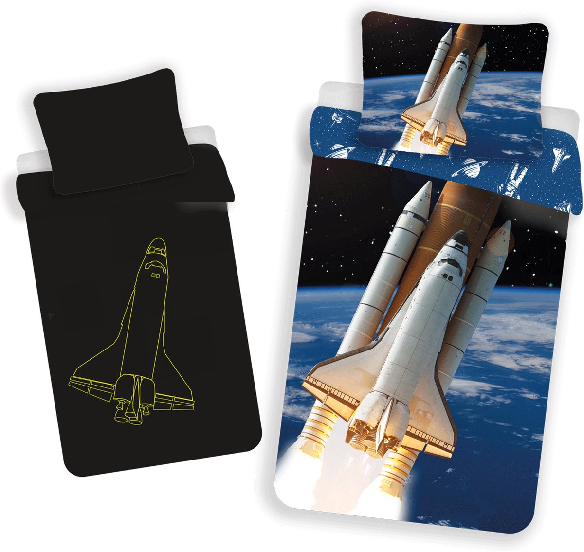 Space dekbedovertrek. Super cool eenpersoons katoenen dekbedovertrek met een afbeelding van een ruimtevaartschip, op de achterzijde een print van astronauten, ruimtevaartschepen en planeten. Een super cadeau voor ruimtevaart liefhebbers.