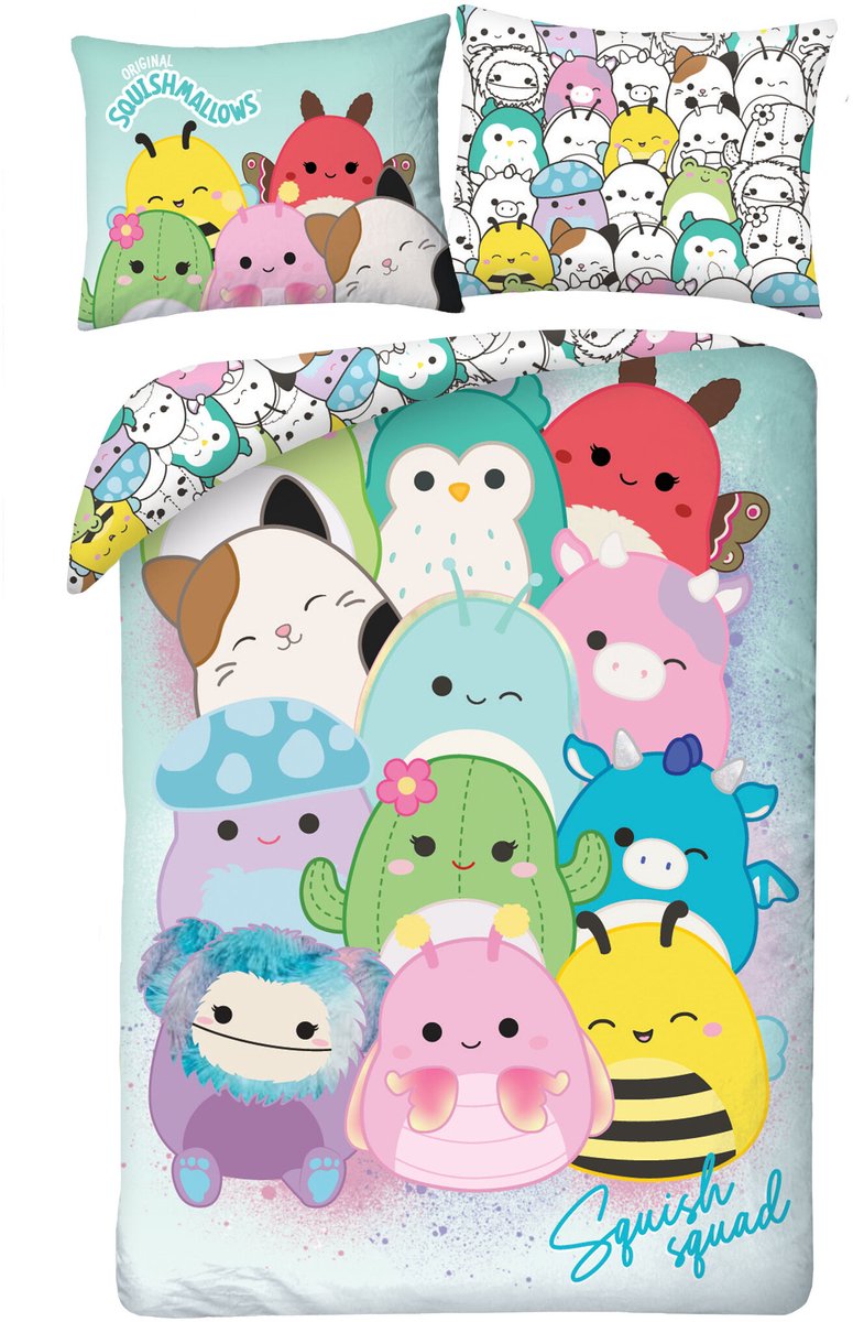 Squishmallows Squish squad Dekbedovertrek 140 x 200 cm (70 x 90 cm). Dit zachte en vrolijke dekbedovertrek, met de schattige Squishmallows karakters, is een musthave voor fans van deze superzachte knuffels. Het ontwerp brengt de geliefde knuffels tot leven op het bed, wat het een echte blikvanger maakt. Dankzij het extra grote kussensloop en de tweezijdige bedrukking kun je het bed op een leuke manier afwisselen. Een perfect cadeau voor elke Squishmallows fan of om zelf van te genieten!