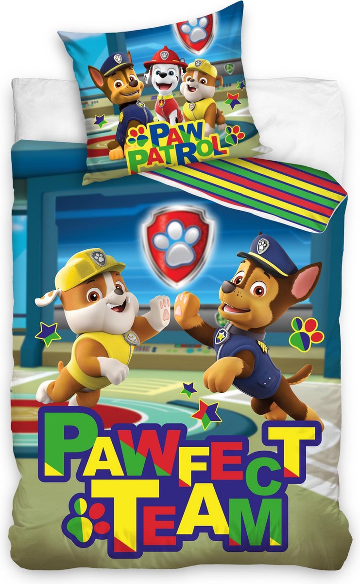 PAW Patrol Dekbedovertrek, Pawfect Team. Mooi katoenen eenpersoons dekbedovertrek met het logo van PAW Patrol. Het overtrek heeft een andere print aan de binnenzijde, zodat er een mooi contrast ontstaat.