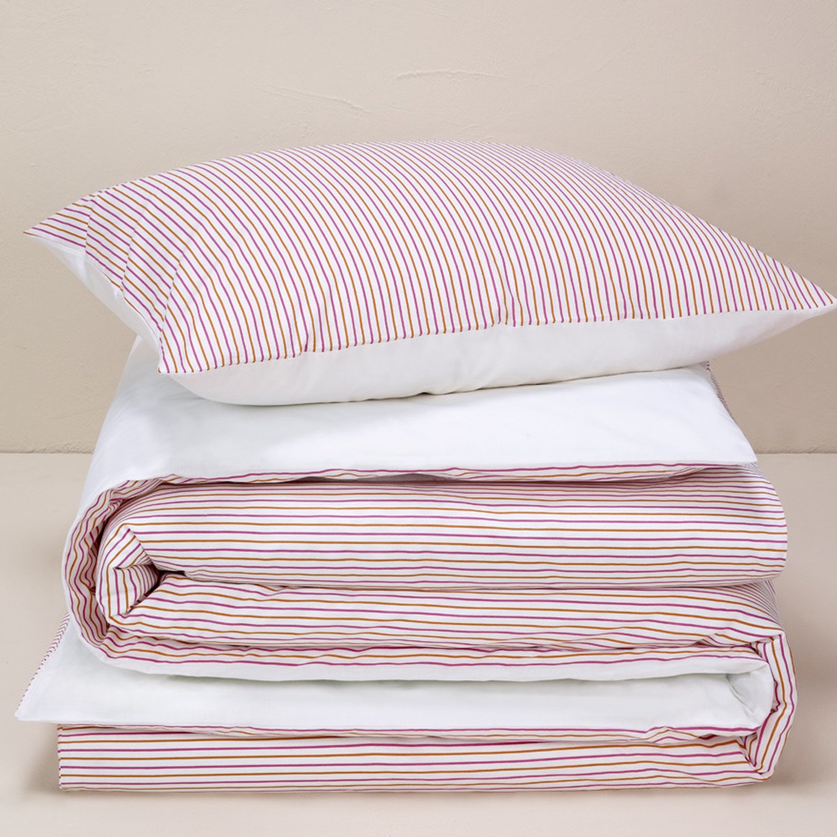 Dit dekbedovertrek omhult je met verfijnde zachtheid en een aangenaam koel comfort, ideaal voor wie houdt van een frisse, elegante slaapbeleving. De hoogwaardige afwerking en de extra wijde flessenhals instopstrook zorgen voor een perfecte pasvorm en een vlekkeloze uitstraling in elke slaapkamer. Het dekbedovertrek heeft een subtiel dessin van roze/oranje strepen op een witte achtergrond. De achterzijde heeft een neutrale witte kleur.