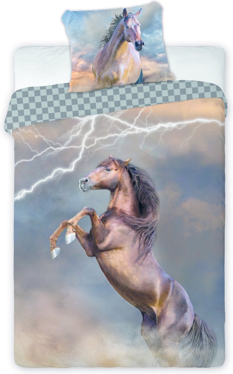 Animal Pictures Dekbedovertrek, Lightning. Een mooi katoenen dekbedovertrek van een steigerend paard. Op de achtergrond zie je een bliksemschicht. Dat is nog eens een krachtig beeld! Mooi voor op elke slaapkamer en een musthave voor elke paardenliefhebber. De achterzijde van het overtrek is voorzien van een ruitpatroon, wat een leuk effect geeft als je het dekbed een stukje openslaat bij het opmaken. Samen met het extra grote kussensloop heb je een echte blikvanger in huis en een geweldig cadeau-idee voor elke fan van paarden!