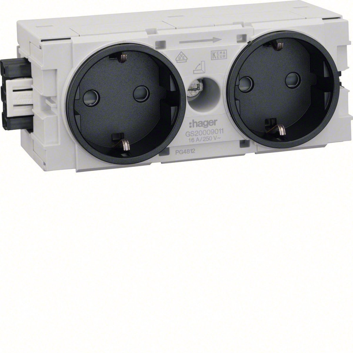 Hager GS20009011 Kabelgoot Insteekmodule (b x h x d) 120 x 50 x 61 mm Grafietzwart (RAL 9011) 1 stuk(s) Stopcontact 2-voudig Wago insteek-/klemtechniek halogeenvrij C-profiel grafietzwart Kanaalstopcontact met verhoogde aanraakbeveiliging, voorbedraad, uitbreidbaar met 3-polig connectorsysteem met snelbevestiging voor apparaatinbouwsysteem met C-profiel. Kabelaansluiting via insteekklemmen 1,5-2,5 mm² of via een connectorsyst... lees meer over dit product