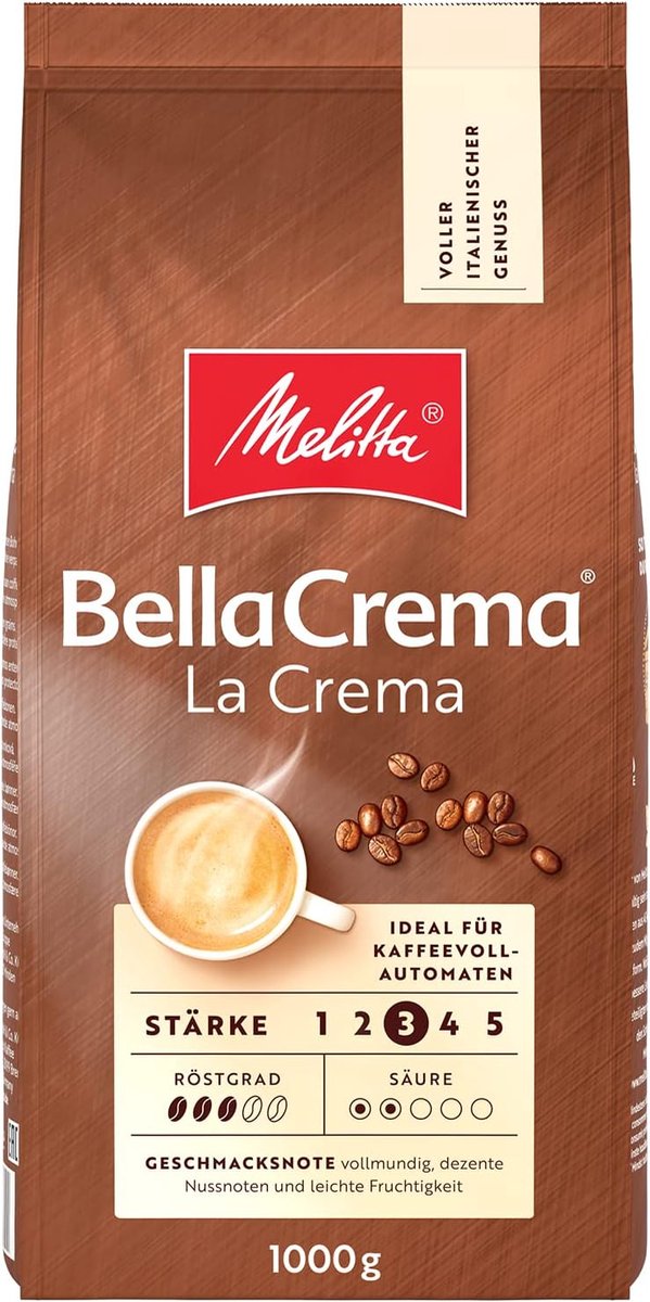 Melitta BellaCrema Café LaCrema 1kg. Gewicht: 1 kg. Soort: Koffiebonen, Kleur van het product: Bruin, Goud