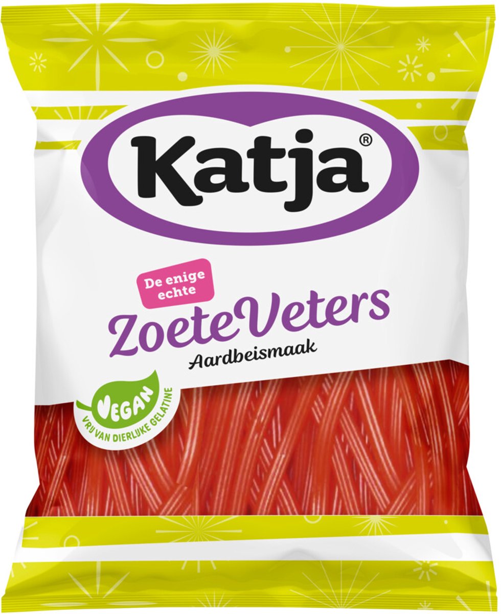 Katja Zoete Veters AardbeiKatja's zoete veters zijn heerlijke snoepveter met die volle aardbeismaak van vroeger. Gemaakt met natuurlijke kleur- en smaakstoffen en volledig vegan! Dat wordt smullen! * Natuurlijke kleur- en smaakstoffen * Vegan * Bevat 20 veters * Met aardbeismaak lees meer over dit product