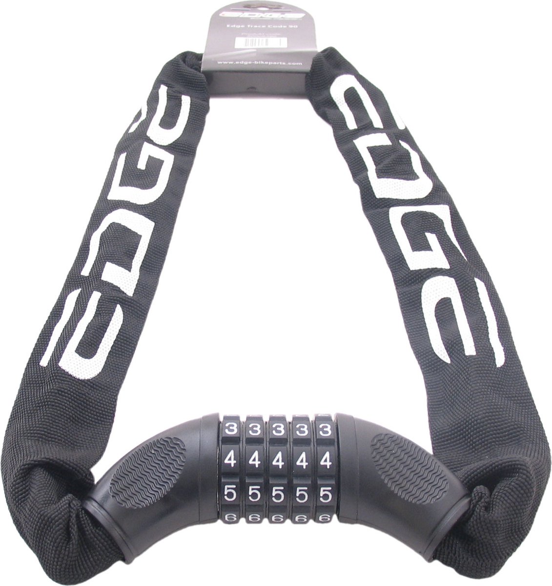 Kettingslot met code Edge Trace Code 90cm - zwart | Het Edge slot Trace Code 90 met cijfercode is een modern kettingslot voor dagelijks gebruik. De lengte is 90 centimeter en de kabeldikte is 6 millimeter. De stevige beschermhoes van textiel voorkomen beschadigingen aan het frame. De vijfcijferige code van het slot kun je geheel zelf instellen met een eigen code. Specificaties: Lengte: 90cm Schakeldikte: ø6mm Kleur: Zwart G... lees meer over dit product