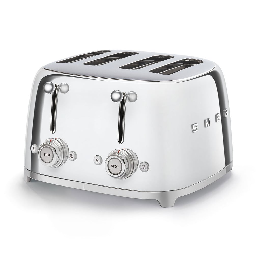Genieten van een geroosterd broodje of een bagel? Met de SMEG broodrooster TSF03 heb je het binnen een mum van tijd in je hand. Kies uit 6 bruining-niveaus en 4 standen (normaal, opwarmen, ontdooien en bagel) om het naar wens te kunnen roosteren. De 4 brede sleuven maken dat je niet hoeft te wachten op je meerdere broodjes maar kan ook gebruikt worden als je maar 2 broodjes wilt roosteren dankzij de 2 onafhankelijke bedieningsknoppen. De broodrooster hoort bij de jaren ’50 stijl lijn van SMEG en staat prachtig in elke keuken. Het stroomsnoer is onder de broodrooster te wikkelen waardoor deze niet storend is. Ook heeft de broodrooster kruimellade zodat je keuken altijd netjes blijft.