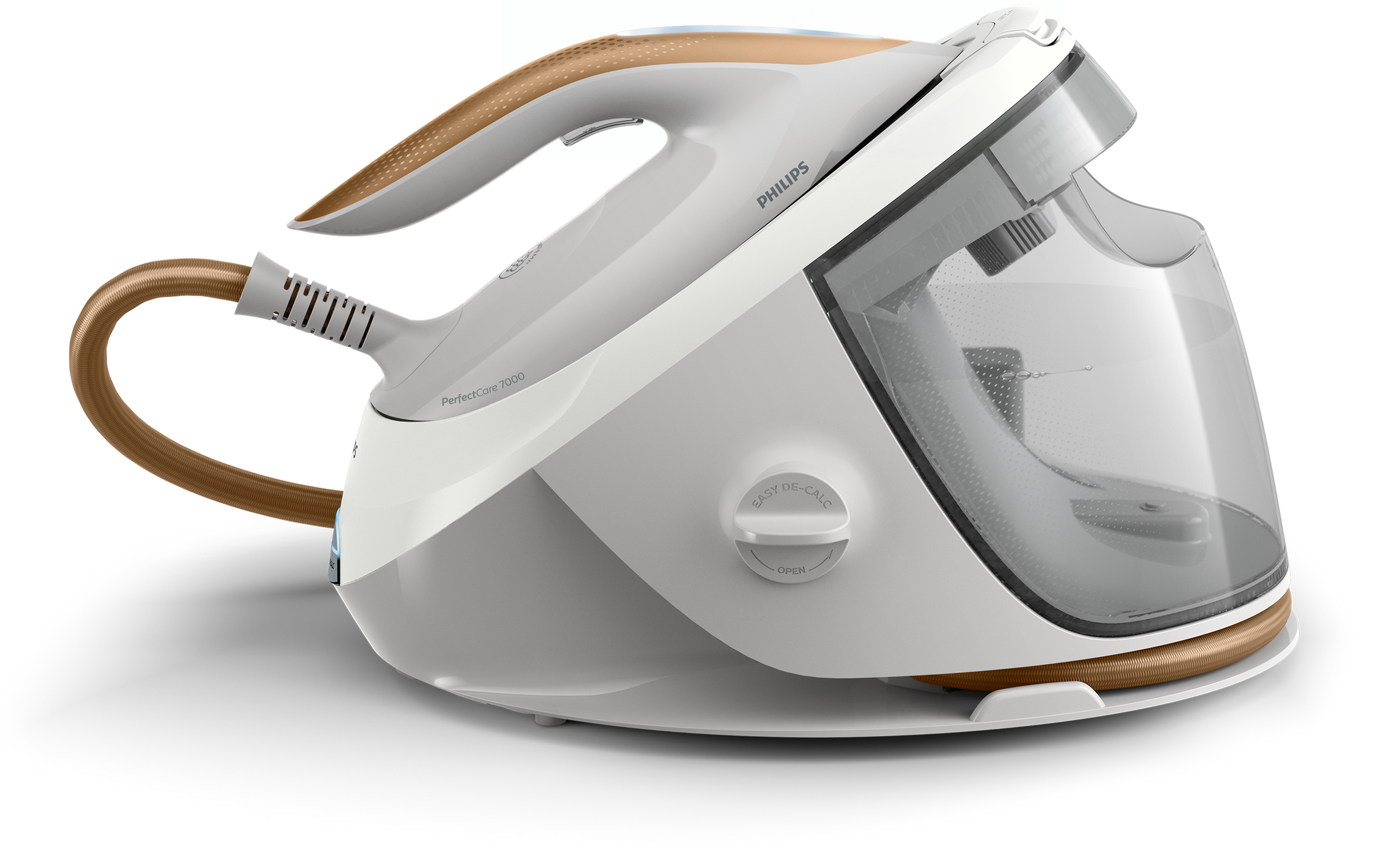 Moeiteloos strijken. Geweldige resultaten. De PerfectCare 7000-series PSG7040/10 is ontworpen voor jouw comfort en gemak. Hij is ultralicht en eenvoudig te hanteren en heeft krachtige stoom zodat je snel geweldige resultaten bereikt. Inclusief OptimalTEMP-technologie zodat er geen brandplekken op strijkbare stoffen komen. Dankzij de OptimalTEMP-technologie behaal je geweldige resultaten met één perfecte temperatuurinstelling. Dit strijkijzer veroorzaakt gegarandeerd nooit brandplekken op strijkbare stoffen als je het apparaat onbeheerd achterlaat. Je kan het apparaat veilig op jouw kleding of strijkplank laten rusten. Strijk alles van zijde tot spijkerbroeken zonder de temperatuur te hoeven aanpassen, en gegarandeerd zonder brandplekken. Dankzij OptimalTEMP zijn geen draaiwiel en instellingen nodig. Daarom hoef je de was niet meer voor te sorteren, of te wachten tot het strijkijzer is opgewarmd en weer is afgekoeld. Je bent altijd klaar voor elke stof. Het transparante waterreservoir van 1,8 liter biedt tot 2 uur ononderbroken gebruik. Wanneer het waterreservoir leeg is, wordt je door het indicatielampje er aan herinnerd dat je het waterreservoir moet bijvullen. Dit kan je eenvoudig onder de kraan doen via de grote vulopening. De SteamGlide Elite-zoolplaat is onze beste zoolplaat voor ultieme strijkprestaties en maximale krasbestendigheid. De roestvrijstalen voet is twee keer zo hard als een gewone aluminium voet en dankzij onze gepatenteerde 6-laagse coating met geavanceerde titaniumlaag glijdt het apparaat uiterst soepel voor het snelste resultaat. Regelmatig ontkalken beschermt jouw strijkijzer, verlengt de levensduur en zorgt voor de beste stoomprestaties. Het exclusieve Easy De-Calc-systeem verzamelt continu kalkaanslag en is uitgerust met een indicatielampje om je te laten weten wanneer het moet worden geleegd. Haal de stekker uit het stopcontact en laat het water en de kalkdeeltjes wegstromen. Vergrendel jouw strijkijzer veilig op het basisstation om het eenvoudig overal in huis te kunnen dragen en het risico van contact met de hete zoolplaat te beperken.