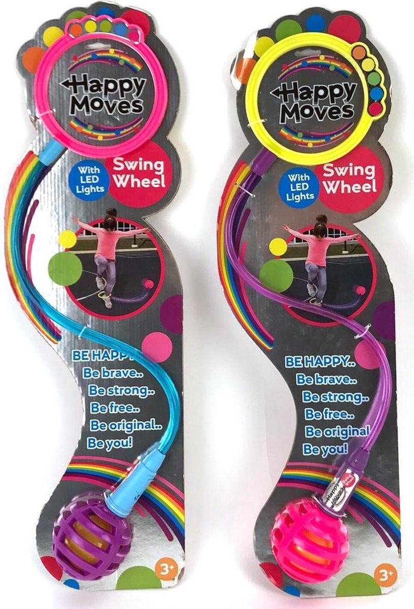 Swingwheels zijn superleuk: Doe de ring om je enkel, draai het swingwheel rond en spring erover met je andere voet. En dit swingwheel is wel heel bijzonder: Hij geeft licht! Er zitten LED lichtjes in en als je daarmee in het donker springt, krijg je een heel bijzonder effect! Het licht werkt op drie AG13 batterijen (inbegrepen). Het swingwheel is geschikt voor kinderen vanafzes jaar. Verkrijgbaar in 2 uitvoeringen. U kunt niet kiezen, maar ontvangt een willekeurige uitvoering.