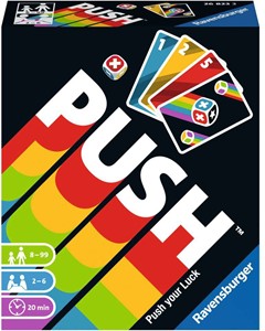 Zoek je spanning en sensatie? Stel je geluk dan op de proef bij dit avontuurlijke kaartspel. Risicovol of liever risicoloos? PUSH your luck ... maar niet te ver! In dit eenvoudig te leren en snelle kaartspel stellen 2 tot 6 spelers hun geluk op de proef en verzamelen de meest waardevolle kaarten om het spel te winnen. Aan het begin leggen de spelers alle kaarten in het midden van de tafel als een gesloten stapel en het spel kan beginnen. Als het jouw beurt is, draai je een willekeurig aantal kaarten van de trekstapel om en leg je ze in maximaal 3 rijen in het midden van de tafel. Met elke getrokken kaart worden de spelers geconfronteerd met de beslissing: meer punten blijven verzamelen, of op tijd stoppen en de beste rij kaarten pakken? Hoe hoger de kaartwaarden, hoe meer punten ze scoren aan het einde van het spel. Maar pas op - de andere spelers pakken de resterende rijen met kaarten! Als je echter besluit om te gokken, kun je te ver gaan. Zodra een kleur en / of een nummer dat al in de rijen staat wordt onthuld, is de beurt voorbij! De speler die te ver is gegaan, verzamelt geen rij. En het wordt nog erger! Als straf moet hij de dobbelsteen gooien en alle kaarten van de kleur uit zijn display op de aflegstapel leggen - en zo waardevolle punten verliezen die uiteindelijk kunnen beslissen of hij wint of verliest! De twee speciale kaarten in het spel zorgen voor speciale spanning. Als je een dobbelsteenkaart verzamelt, moet je ook de dobbelsteen gooien en kaarten uit je display verwijderen. Aan de andere kant beslissen kaarten om van richting te veranderen welke speler eerst een rij kaarten mag kiezen en een onverwachte wending mag nemen! Inhoud: 120 kaarten, dobbelsteen, beschrijving