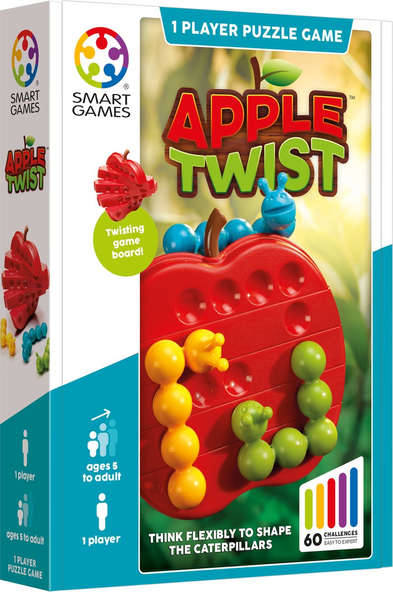 Deze originele breinbreker van Smart Games laat je hersens kraken! Bij dit spel kunnen niet alleen de puzzelstukken van vorm veranderen, maar ook het spelbord! Drie hongerige rupsen willen van dezelfde appel eten. Kan jij ze de juiste vorm geven zodat ze allemaal op de appel passen? Apple Twist bevat 60 opdrachten die oplopen in moeilijkheidsniveau.