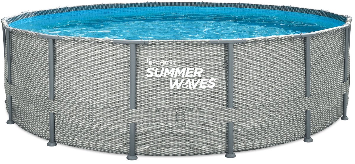 Summer Waves Frame Zwembad Elite met Filterpomp 488 x 122 cm - Grijs Wicker. De buitenkant van het Elite Frame Zwembad heeft een lichtgrijs rotan patroon, ook de frames zijn grijs. Het bad is eenvoudig en snel op te zetten, en heeft een stevige constructie.