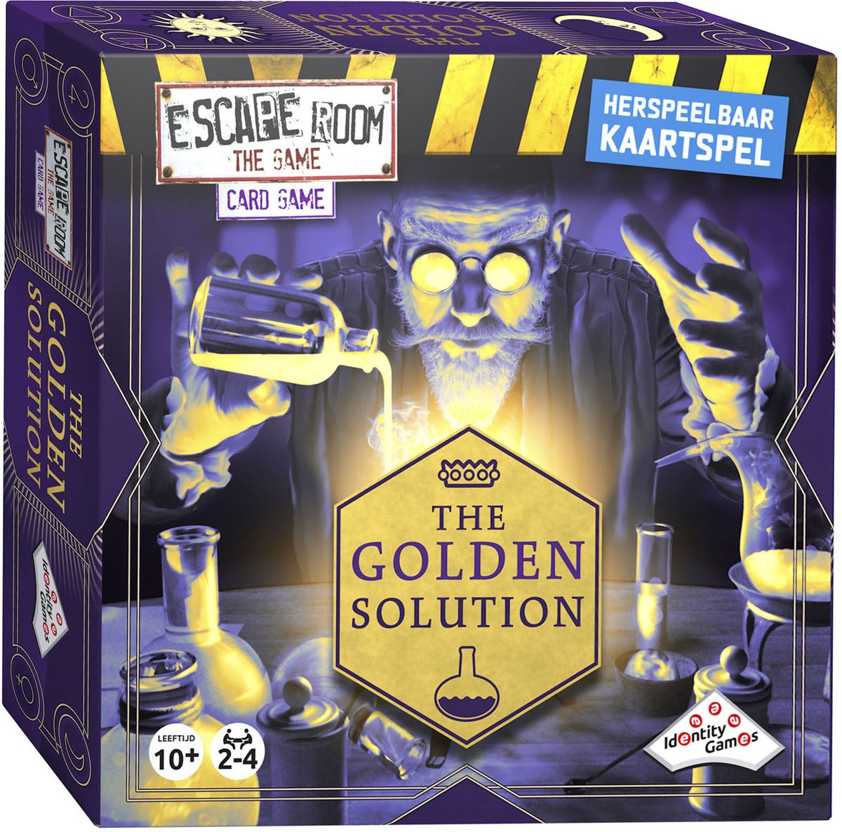 Kruip in de huid van een groep middeleeuwse alchemisten in dit herspeelbare Escape Room The Game kaartspel: The Golden Solution. Brouw samen als team alchemistische mengsels door juiste combinaties van genummerde ingrediëntkaarten te maken en speel ingrediëntkaarten vrij om alchemistische formules te voltooien. Maar pas op: speciale gebeurtenissen kunnen de spelregels in jullie nadeel veranderen en jullie mengsel plotseling instabiel maken!