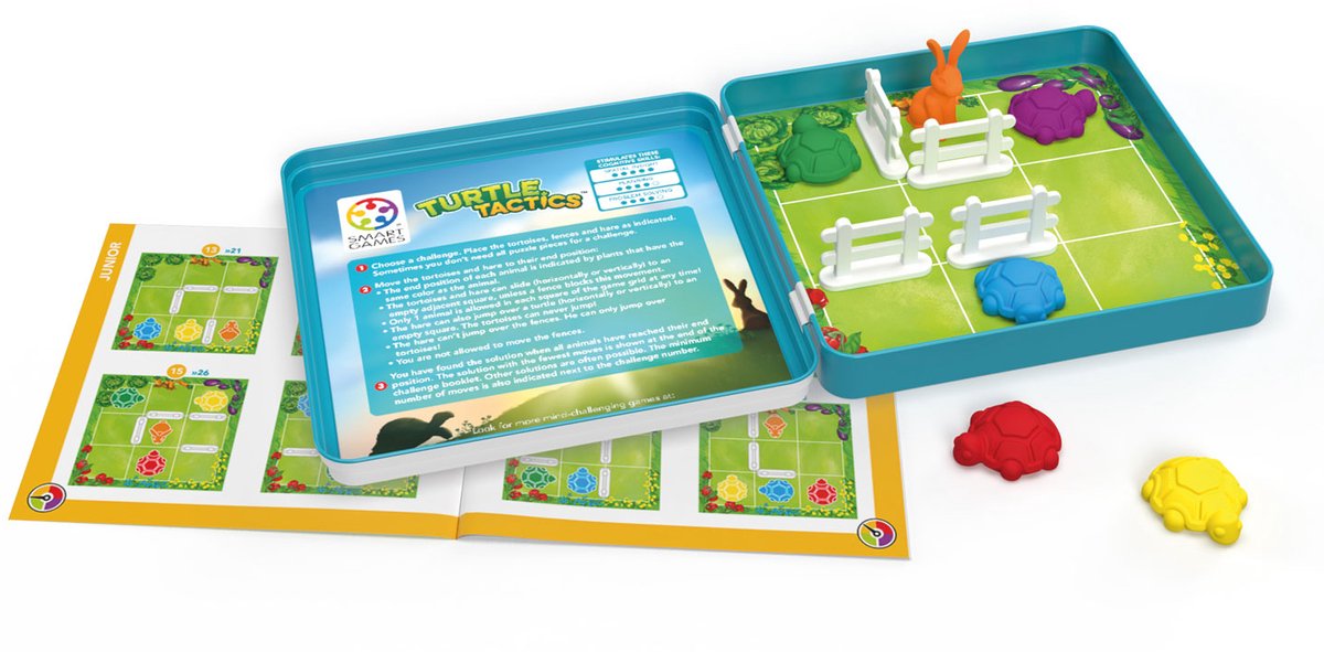 Is het gras altijd groener aan de overkant? Mmmmm, het gras aan de andere kant van het hek lijkt wel veel groener! Help de haas en schildpadden om bij hun favoriete maaltijd te komen. Wie is er het eerst? De schildpadden of de haas? De schilpadden kunnen enkel over de bodem schuifelen, maar de haas kan ook springen. Turtle Tactics is een leuke sequentiële puzzel met magnetische puzzelstukken in een handig metalen doosje. Vind jij voor alle 48 uitdagingen het juiste hazenpad? Spelregels Stap 1: Kies een opdracht. Plaats de schildpadden, haas en hekjes zoals aangeduid. Stap 2: Beweeg de schildpadden en de haas naar hun eindpositie (aangeduid door planten met dezelfde kleur als het dier). Alle dieren kunnen horizontaal of verticaal verschoven worden naar een naastliggend leeg vak. De haas kan ook over een schildpad naar een leeg vakje springen (horizontaal of verticaal). Geen enkel dier kan over hekjes springen. Stap 3: Je hebt de oplossing gevonden wanneer alle dieren hun eindpositie bereikt hebben.