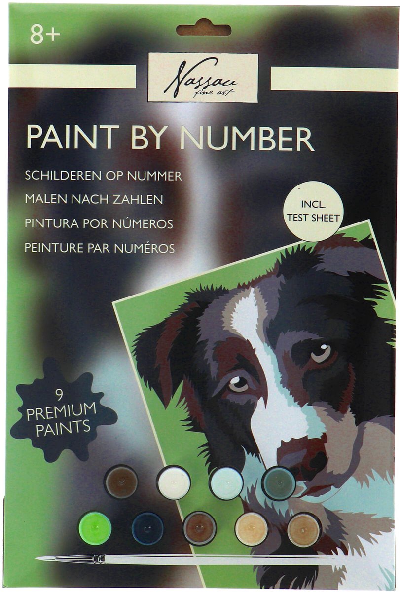 Dit schilderen op nummer set bevat een canvas met de afmetingen X bij Y cm en hoogwaardige verf in diverse kleuren om uw hondenafbeelding tot leven te brengen.