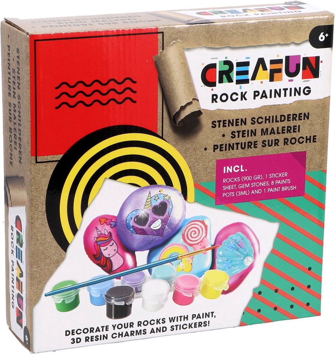 Creafun hobbyset stenen schilderen creatief speelgoed knutselsetMet deze creatieve hobbyset stenen schilderen van Creafun beleef je urenlang knutselplezier! Laat je fantasie de vrije loop en tover gewone stenen om tot ware kunstwerkjes in jouw favoriete kleuren en patronen. Het pakket bevat alles wat je nodig hebt: 900 gram stenen, een stickervel, plaksteentjes, acht kleuren verf en een handig verfkwastje. Als de verf droog is, kun je de stenen nog verder versieren met de bijgeleverde stickers en glinsterende steentjes. Zo maak je elk steentje uniek! De set is geschikt voor kinderen vanaf 6 jaar en ideaal voor een regenachtige middag of een gezellige knutselmiddag met vrienden of familie.Extra informatieCompleet pakket met stenen, verf, stickers en plaksteentjesStimuleert creativiteit en fijne motoriekGeschikt voor kinderen vanaf 6 jaarPerfect voor knutselmiddagen en cadeau-ideeën.