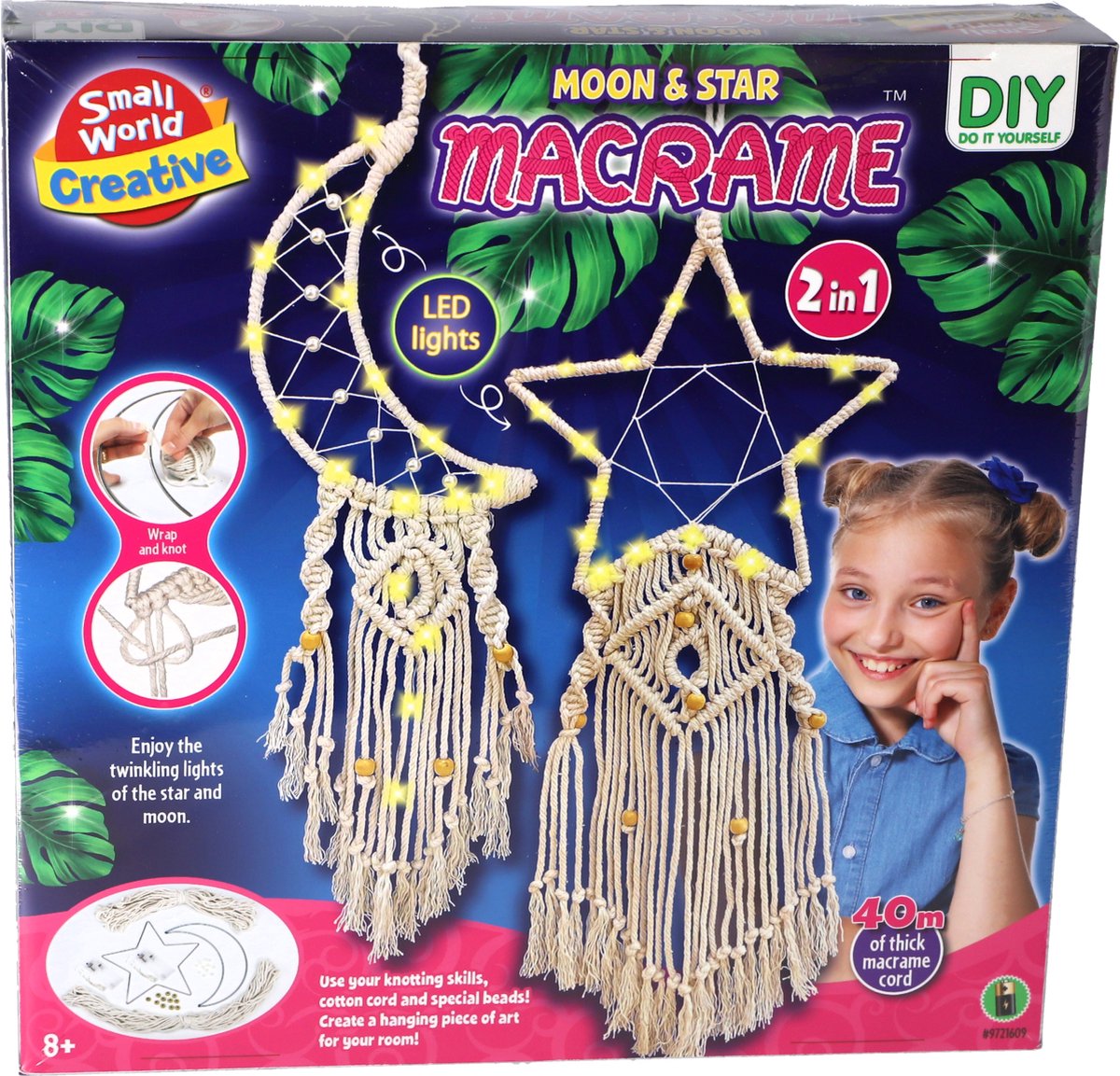 Maak je eigen unieke hangdecoratie met deze Macrame maan en ster met licht! Met verschillende knooptechnieken creëer je een prachtige decoratie die ook nog eens verlicht wordt. De maan en ster hebben LED-verlichting en zijn perfect voor het decoreren van je kamer. Geschikt voor kinderen vanaf 8 jaar.