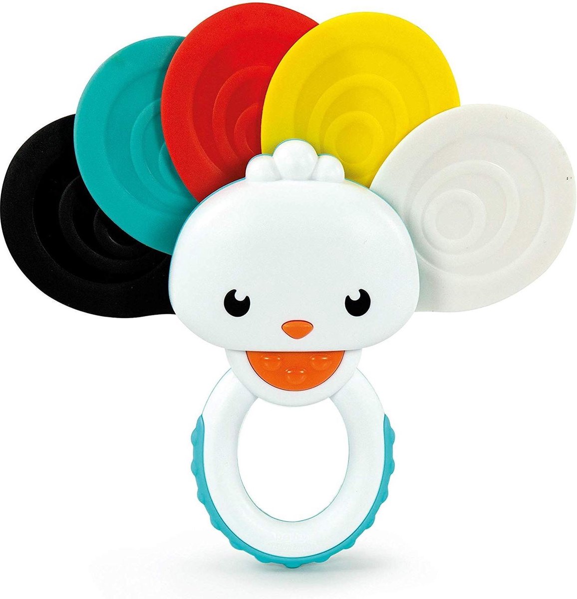 Clementoni Rammelaar Pauw Een lieve, kleine pauwvormige rammelaar, ideaal voor het stimuleren van het zicht bij baby's tijdens hun eerste maanden. De zachte pauwstaart is geschikt voor de dentitiefase. De veren openen en sluiten met overlappende bewegingen om nieuwe kleuren te creëren. Beschikt over een praktische ring. Reliëftextuur om handmatige vaardigheden te stimuleren. lees meer over dit product