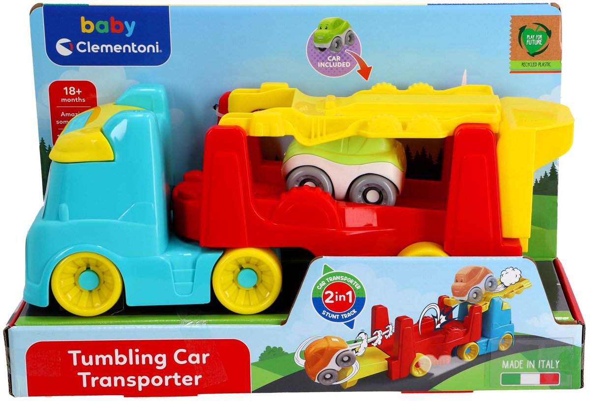 Clementoni - Tumbling Car - Transportwagen - vanaf 12 maanden De Clementoni babyvrachtwagen met tuimelauto’s is interactief speelgoed dat de allerkleinsten uitnodigt om te verkennen, te duwen en te spelen. De vrolijk gekleurde vrachtwagen en de bewegende tuimelauto’s zorgen voor urenlang plezier en stimuleren de zintuigen van kinderen. Kenmerken op een rij Interactieve vrachtwagen met tuimelauto’s Vrolijk gekleurd en aantrekk... lees meer over dit product