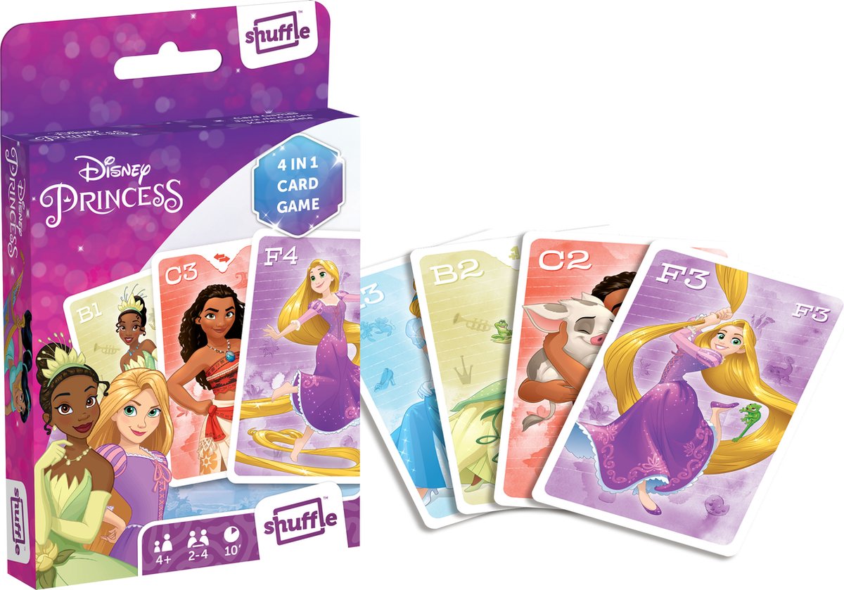 Een eenvoudig spel kaarten krijgt een heel andere dimensie dankzij onze 4in1 Shuffle-spellen. Samen met je favoriete Disney PRINCESS karakters beleef je nu uren spelplezier. Een kwartet, actiespel, memo of snapspel? Je hebt al deze toppers bij de hand met 1 kaartspel.