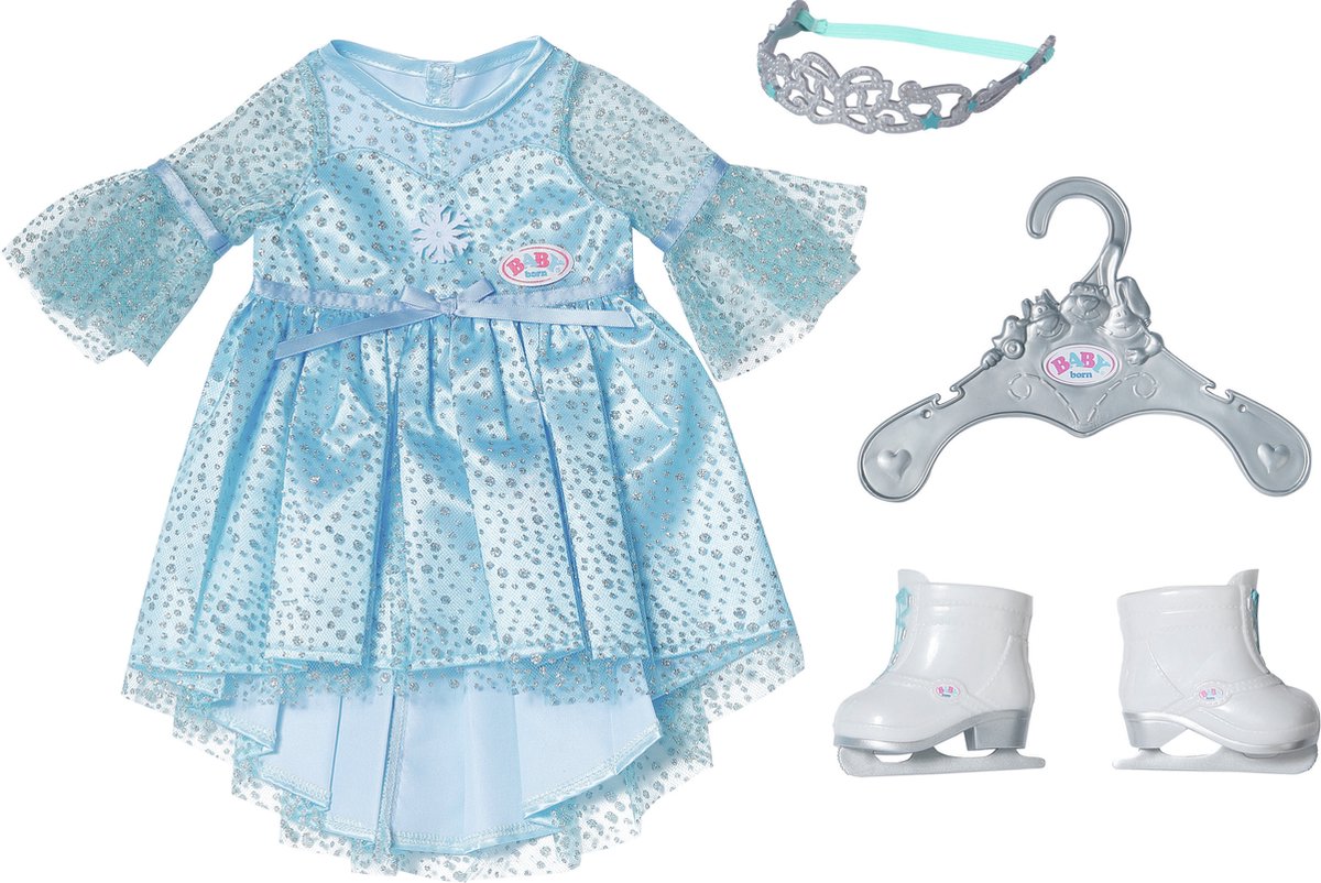 Een echte blikvanger op het ijs: dat is BABY born in haar nieuwe, glinsterende ijsprinsessenjurk. Op de bijpassende kunstschaatsen glijdt ze moeiteloos over het bevroren meer samen met Teddy en Carla. Freestyle: de tiara blijft op haar hoofd zitten tijdens de vele pirouettes. Een tulen droom: de zachtblauwe jurk heeft lange mouwen en is versierd met glittersteentjes Elegant op het ijs: ook inbegrepen zijn bijpassende kunstschaatsen en een tiara Niet alleen voor BABY born: BABY born Sister en Beer kunnen ook ijsprinsessen worden in de jurk Accessoires van topkwaliteit voor de BABY born-speelpop. Voor verbeterd, gevarieerd en langdurig speelplezier.