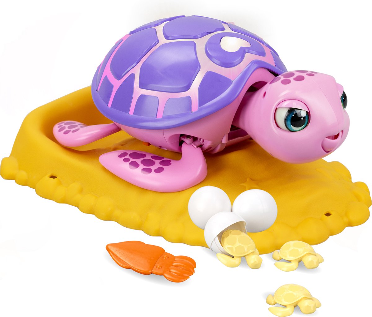 Je zult versteld staan wanneer je ziet hoe je schildpad tot wel 3 eieren legt, en in elk ei zit een schattig baby schildpadje! Goed gedaan, Mama Turtle! Laten we haar belonen door haar favoriete eten te geven. En als je wilt, kunnen de eieren terug in je schildpad worden geplaatst om die magische momenten steeds opnieuw te beleven. Zet je schildpad op het eiland waar ze zich veilig voelt en speel met haar wanneer je wilt! Leeftijdsindicatie: 3 jaar+. Batterij informatie: 3 x AAA batterijen (meegeleverd)