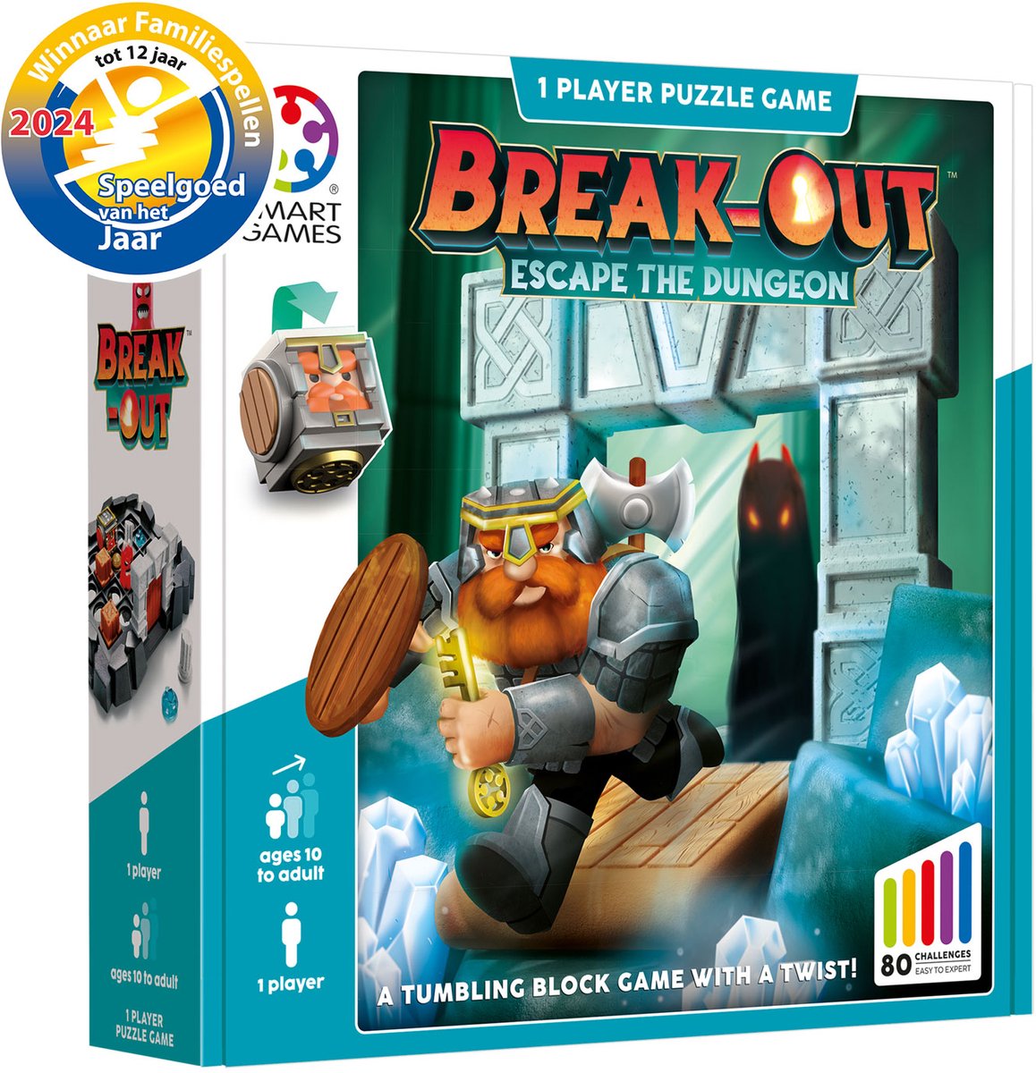 Het doel van Break Out is om door de poort uit de kerker te ontsnappen. Leid je held over een pad langs kratten, pilaren en kristallen om de weg naar de uitgang te vinden. Open de poort door de magische sleutel op te pakken, maar zorg ervoor dat je in de juiste positie staat om de deur te openen! In sommige uitdagingen moet je ook het monster verslaan door het wapen op te pakken voordat je kunt ontsnappen. Spelregels Stap 1: Kies een uitdaging. Plaats de stukken zoals aangegeven in de uitdaging. Stap 2: Rol je held door de kerker en om obstakels heen om de magische sleutel te vinden en op te rapen. In de uitdagingen met het monster moet je ook het wapen oprapen. Stap 3: Kom op de juiste positie aan bij de poort. Als je de magische sleutel hebt opgepakt, gaat de poort open en kun je ontsnappen uit de kerker!