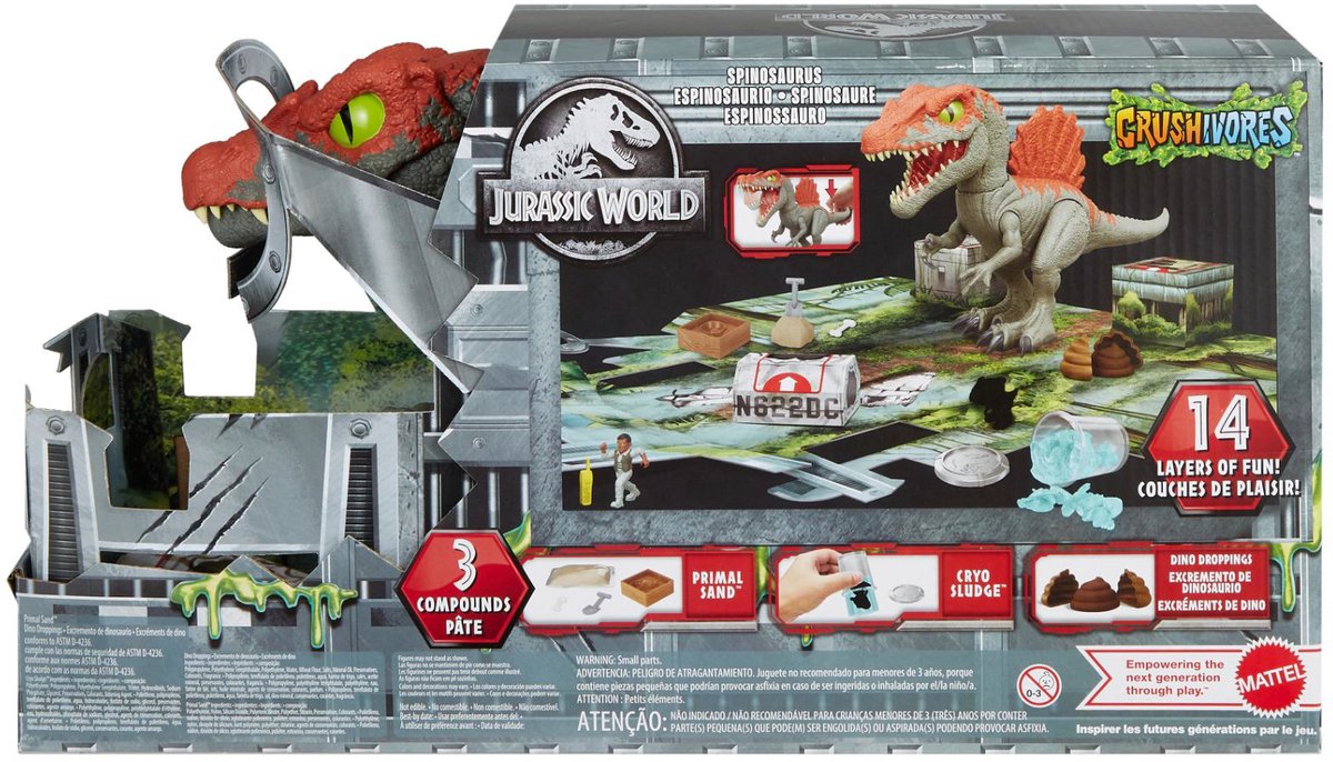 De Spinosaurus Kooisloper is veel meer dan alleen een dinosaurusfiguur. Het is een regelrecht avontuur met zintuiglijk dinoplezier en -verhalen! Liefhebbers van dinosaurussen kunnen de spanning uit de Jurassic World reeks herbeleven door meerdere onthullingen en verrassingen te ontdekken in dit pakket. Naast de spectaculaire Spinosaurus van ruim 32 cm lang zit er een minidino in Cryoslijm, oerzand, deegdrollen en nog veel meer! Een geweldig cadeau voor fans van Jurassic World en dinoplezier, vanaf 4 jaar. Afwijkende kleuren en versieringen mogelijk.