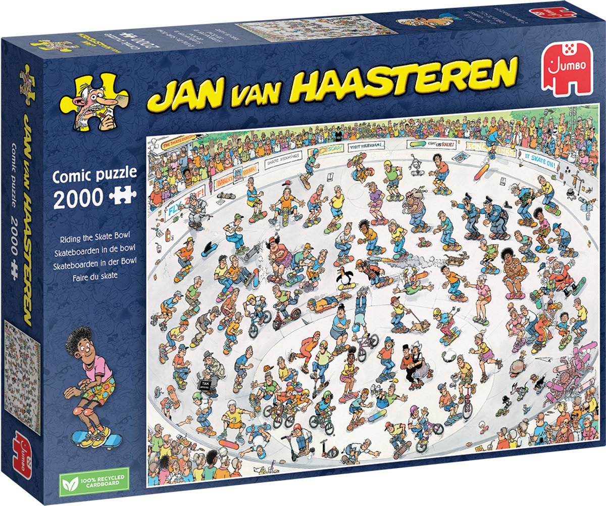 Jan van Haasteren - Skateboarden in de bowl - 2000 stukjes puzzel Wat een actie in deze skate bowl! Werkelijk iedereen van de Jan van Haasteren familie voert tricks en manoeuvres uit. Met hoge snelheid gaat schoonmoeder door de bowl en ook Jan lijkt zijn draai te hebben gevonden op deze chaos aan skateboarders, BMX-rijders en andere sporters. Een Jan van Haasteren puzzel is meer dan een gewone legpuzzel: het is een avonturens... lees meer over dit product