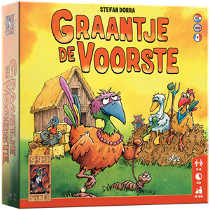 Vlot blufspel voor het hele gezin! Het pluimvee op de boerderij houdt een groot buffet. De vossen uit de omgeving eten ook graag mee, maar die hebben duidelijk een ander beeld van de samenstelling van het menu. Speel pluimveekaarten om graankorrels te verzamelen en vossenkaarten om juist pluimvee te verschalken. De locaties waar je de kaarten naartoe stuurt, bepalen wie er met de buit vandoor gaat. Over het spel In dit vlotte blufspel kunnen kippen, ganzen en ander pluimvee die op het juiste moment op de voederbak afgaan een graantje meepikken. Hetzelfde geldt echter voor de vossen, maar die willen liever het pluimvee verschalken… Wie speelt er De Graantje de Voorste? Graantje de Voorste is vooral geschikt voor spelers die van bluf en onverwachte wendingen houden. Omdat ze elke ronde tegelijkertijd een gedekte kaart spelen, moeten ze proberen om in te schatten wat de andere spelers doen. Dat kan leiden tot makkelijk voedsel vinden, maar ook tot het verdelen ervan of zelfs het vechten erom. Dit blufspelletje is eenvoudig te leren en dus leuk voor het hele gezin! Hoe speel je Graantje de Voorste? Elke ronde worden zes hokken met graan gevuld. Iedere speler kiest dan een kaart uit zijn hand en legt die gedekt voor zich neer. De kleur van de kaart bepaalt naar welk hok het pluimvee of de vos gaat. Het getal op de kaart geeft de puntenwaarde van het dier aan. Die is van belang als meerdere vogels naar hetzelfde hok gaan of als een vos zo'n beest te pakken krijgt. Een vogel die in zijn eentje naar een hok gaat, pikt alle graankorrels weg. Bij meerdere vogels kunnen ze de boel met elkaar delen, maar als er eentje is die dat verdelen maar niks vindt, gooien ze allemaal met een dobbelsteen en tellen ze het resultaat bij hun puntenwaarde op. Wie het hoogste resultaat heeft, mag alle graankorrels hebben. Een vos die in zijn eentje naar een hok gaat, krijgt niets (hij lust geen graan),maar is er pluimvee aanwezig, dan eet hij dat allemaal op. Gaan er meerdere vossen naar hetzelfde hok, dan moeten ze dobbelen. Vossen zijn namelijk egoïstische dieren en delen uit principe niets! Zijn de laatste graankorrels in de hokken gestrooid, dan begint de laatste ronde. Wie uiteindelijk de meeste punten met zijn verzamelde graankorrels en pluimveekaarten heeft binnengehaald, is de winnaar.
