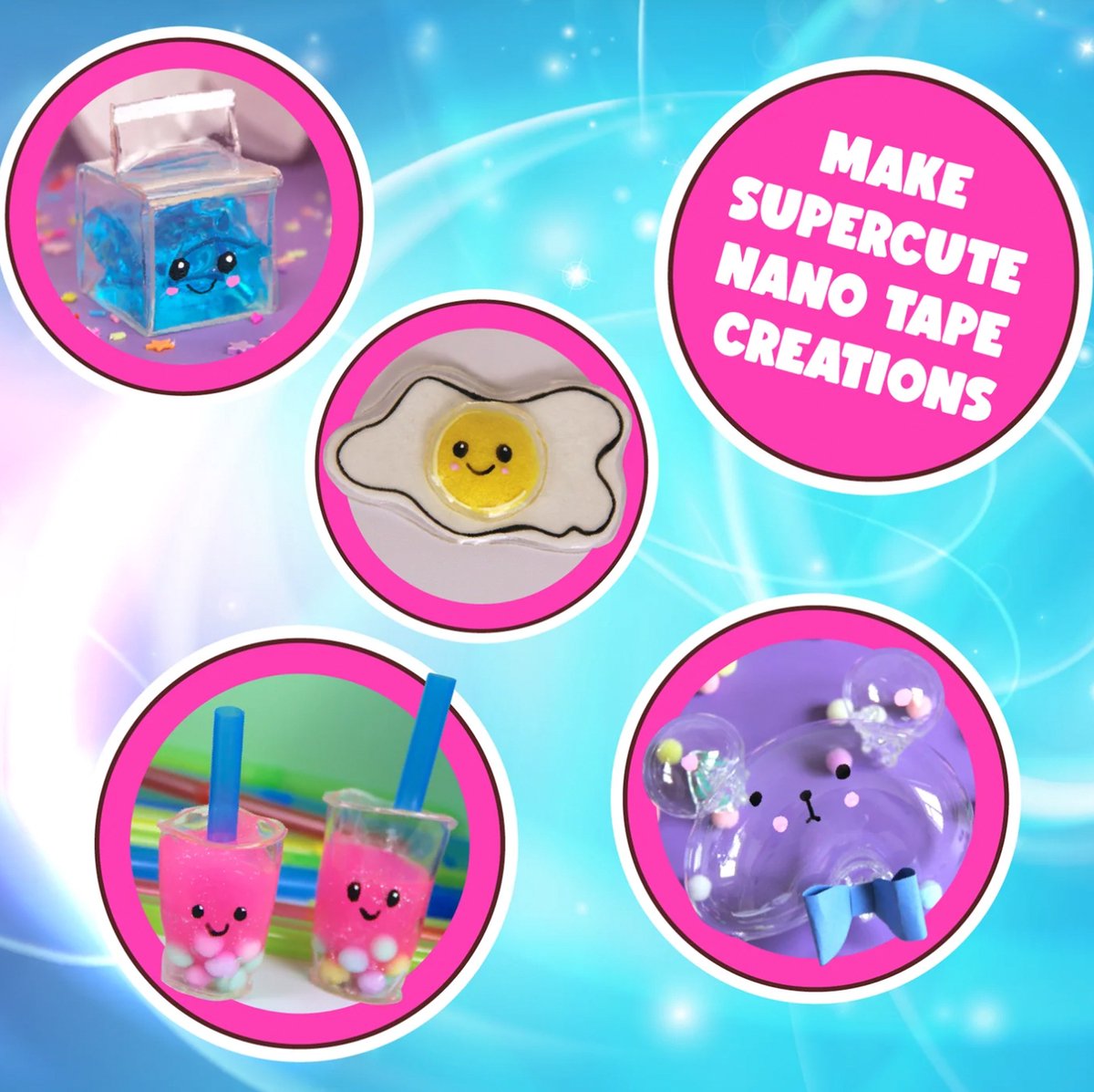 Van superleuke stickers en slijmerige squishies tot bubbelhuisdieren en tasbedels, deze veelzijdige tape kan worden gebruikt om allerlei leuke creaties te maken. Knip, plak, voeg toe, blaas of pomp en zie hoe je nanotape creatie tot leven komt! Deze Cute Cloud set bevat: 2 rollen transparant nanotape, 1 rol geel nanotape, 1 rol paars nanotape, 1 nanotape-pomp, 2 viltstiften, 4 plastic rietje, 2 potjes slijm, 1 confetti, bedels, 1 sleutelhanger, 2 sheets met uitdrukbare plaatjes, 1 raam zuignap en nog veel meer.