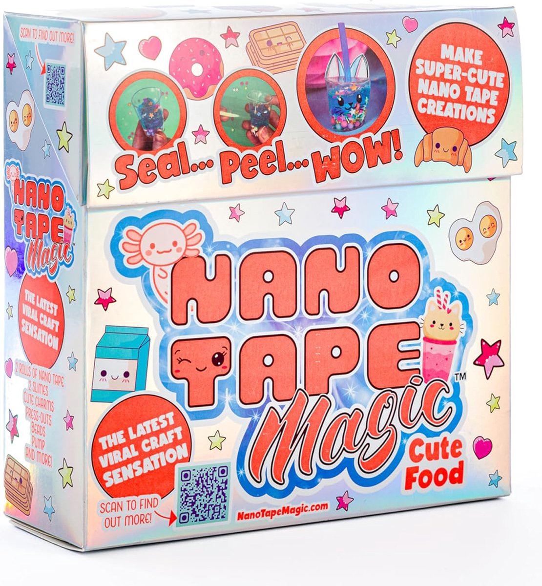 Het is tijd voor magie met Nano Tape Magic! Probeer nu zelf de virale knutseltrend! Deze leuke Cute Food knutselset bevat alles wat je nodig hebt om 5 superleuke nano tape creaties te maken. Maak je eigen magische ontwerpen: een squishy Bubbelthee Katje, bun-in-a-million Hamburger, eggs-ellent Spiegelei, Zoet Traktatietasje en Sweet Squishies.