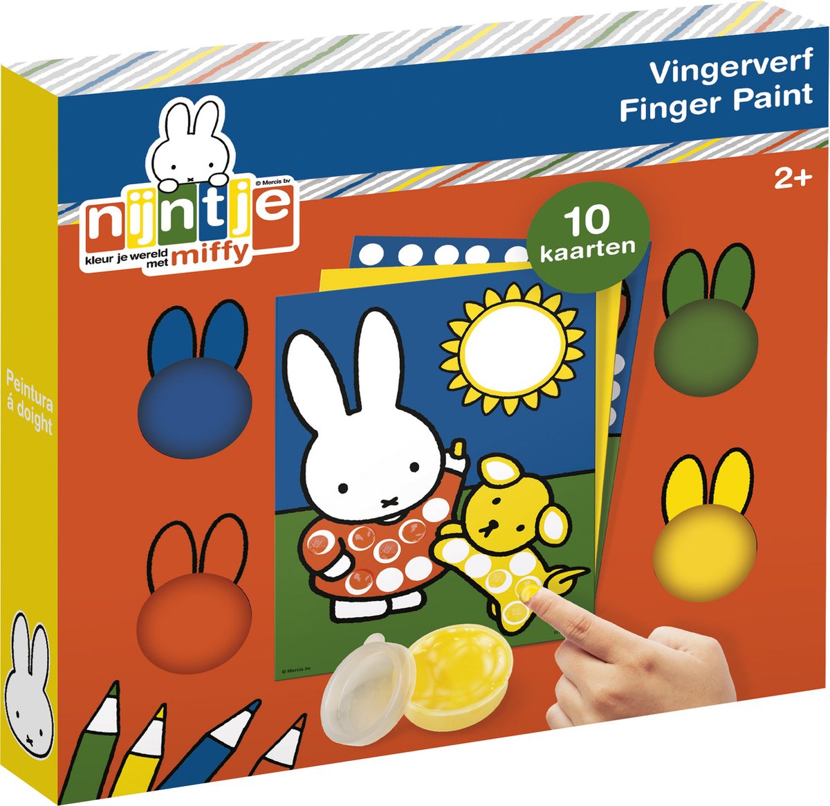 Ga creatief aan de slag met Nijntje en haar beste vriendjes. Versier de vrolijke afbeeldingen van Nijntje, Nina, Snuffie en nog veel meer, met vingerverf. Doop je vingers in de kleurrijke verf en maak de mooiste creaties! De set bevat 4 kleuren verf en 10 mooie afbeeldingen. Perfect voor kleine kunstenaars vanaf 2 jaar!