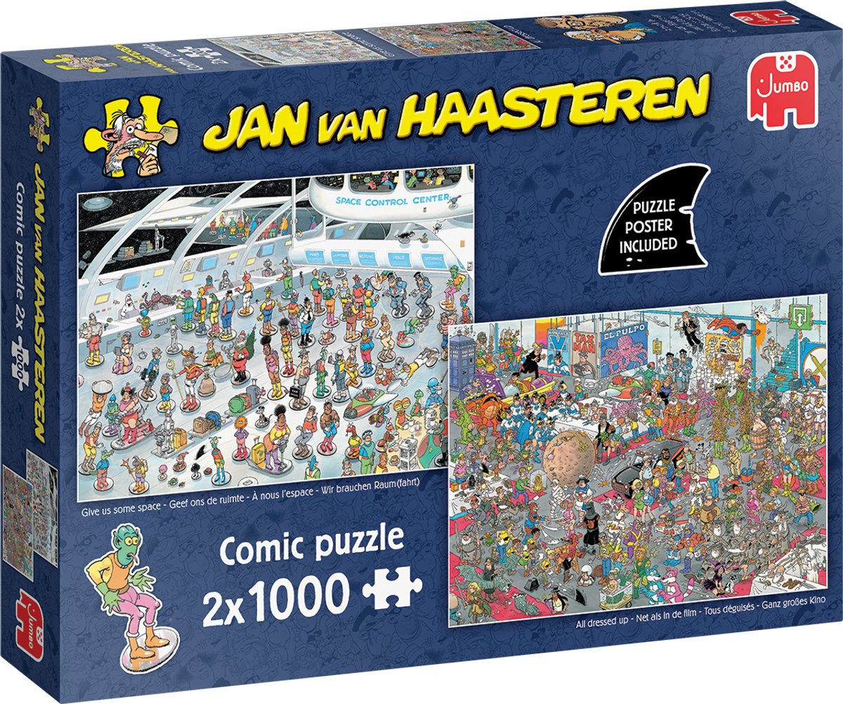 Jan van Haasteren - Geef ons de ruimte & Net als in de film In deze 2-in-1 puzzel nemen we een kijkje in de toekomst en in de wereld van comicon! Stap in de tijdmachine en reis mee naar een wereld vol sterren en technologie: hoe zou een ruimtestation er in de toekomst uitzien? En in wat voor bizarre, futuristische wereld zal de Jan van Haasteren-familie straks ronddwalen? De familie van Jan van Haasteren duikt in de betoverend... lees meer over dit product
