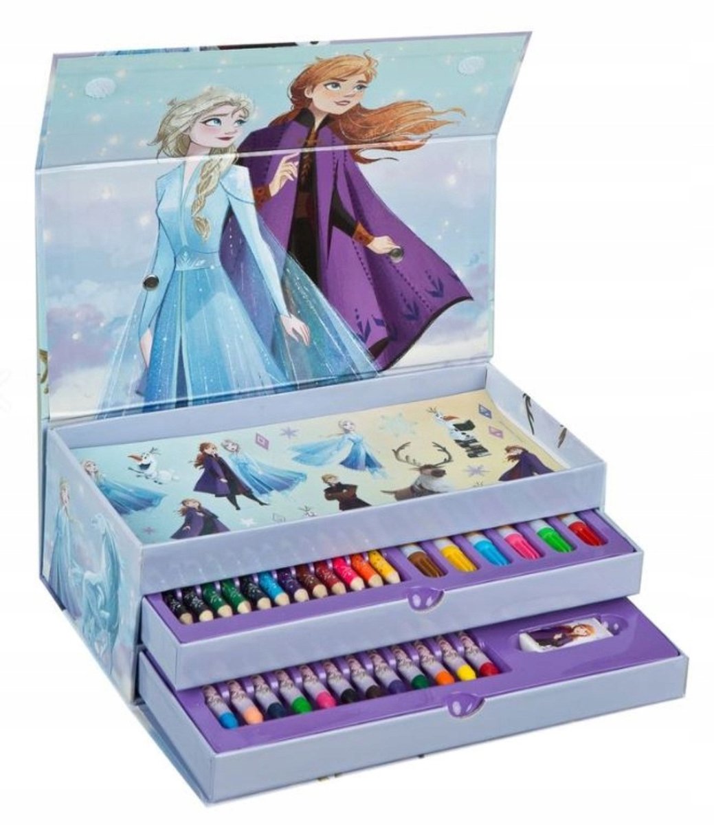 Ga op een magisch creatief avontuur met deze prachtige Frozen kleurdoos! De luxe tekendoos in boekvorm is versierd met Elsa, Anna en Olaf, en zit boordevol kleurpotloden, stiften, waskrijtjes en andere creatieve benodigdheden. Perfect voor jonge Disney-fans die dol zijn op tekenen en knutselen! Dankzij de overzichtelijke lades en stevige magnetische sluiting is deze set ideaal voor thuis én onderweg. Creativiteit was nog nooit... lees meer over dit product