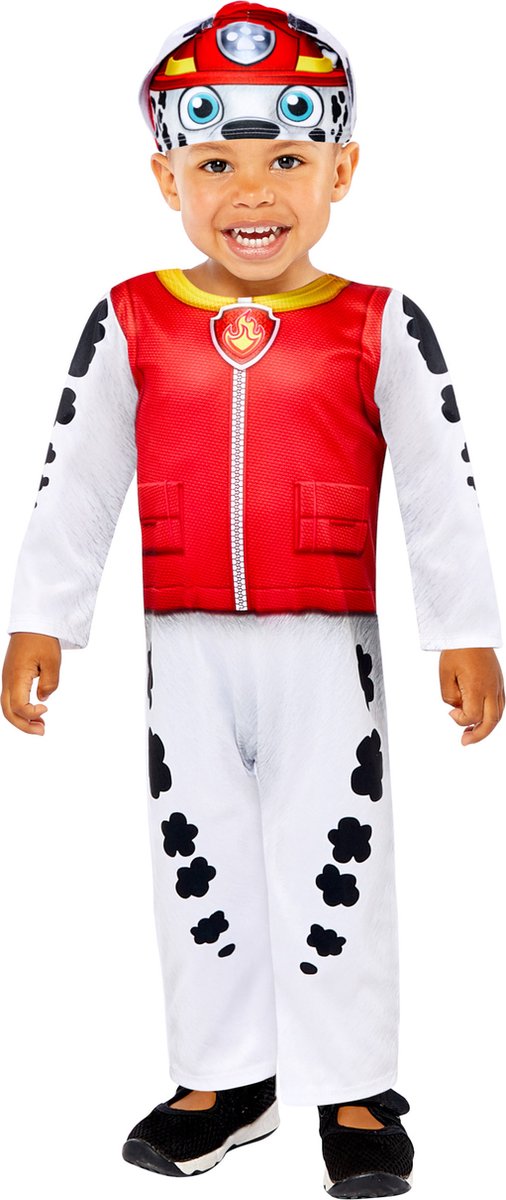 Dit Marshall babykostuum is officieel gelicenseerd PAW Patrol en bestaat uit een jumpsuit en hoofddeksel. De bovenkant van het pak stelt het brandweer uniform van Marshall voor, terwijl de armen en benen wit zijn met zwarte vlekken. De hoofdtooi maakt de outfit compleet door te lijken op de helm en de grote blauwe ogen van de beroemde brandweerman uit de tekenfilm PAW Patrol. Help de PAW Patrol in zijn avonturen met deze Marshall vermomming voor Carnaval of op een PAW Patrol verjaardagsfeestje met thema!